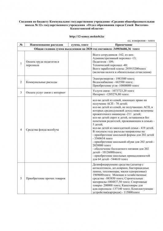 Сведения по бюджету КГУ "СОШ №12" 2020 год