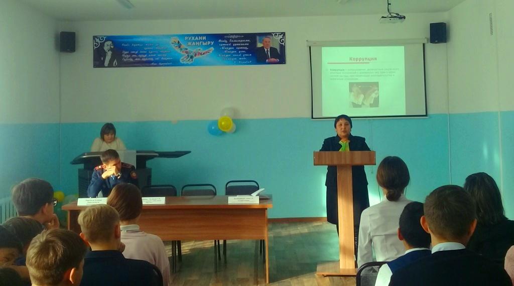 22.11.2018ж. мектебімізде "Адал жол" іс-шаралар марофонының аясында "Жемқорлыққа жол жоқ" атты 9-11 сыныптар арасында тəрбиелік сағаты өтті.