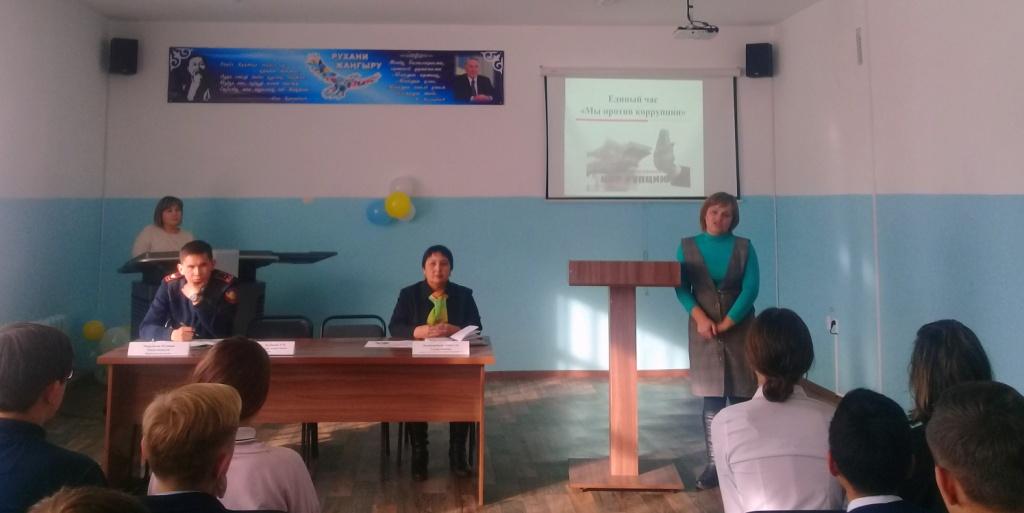 22.11.2018 г. В нашей школе провели единый час в рамках антикоррупционного марафона "Адал жол""Мы против Коррупции" среди 9-11 классов.