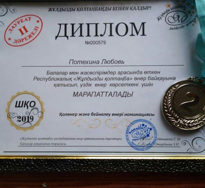 "Қолөнер жəне бейнелеу өнері" номинациясы бойынша II дəрежелі Лауреат.
