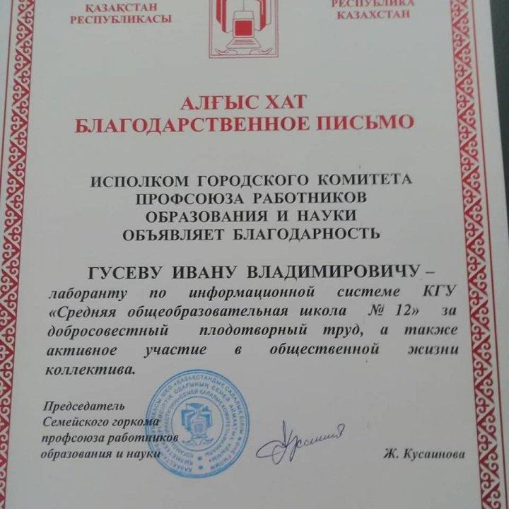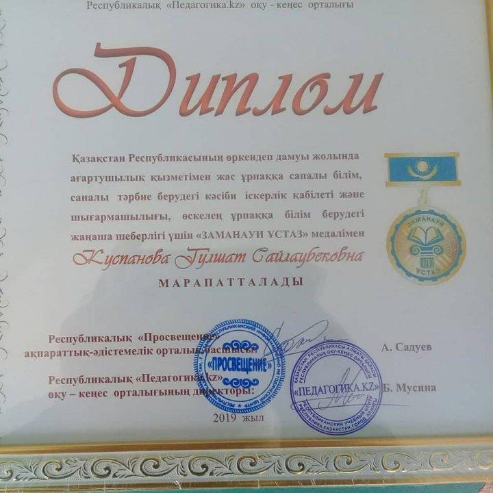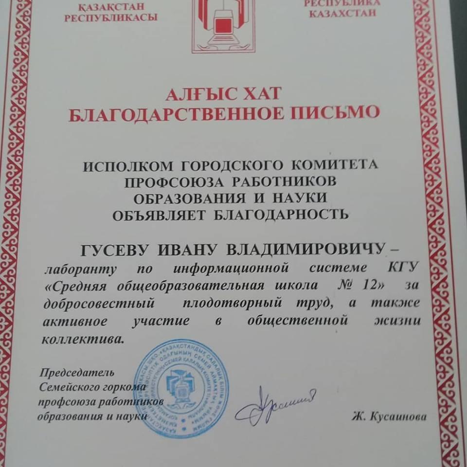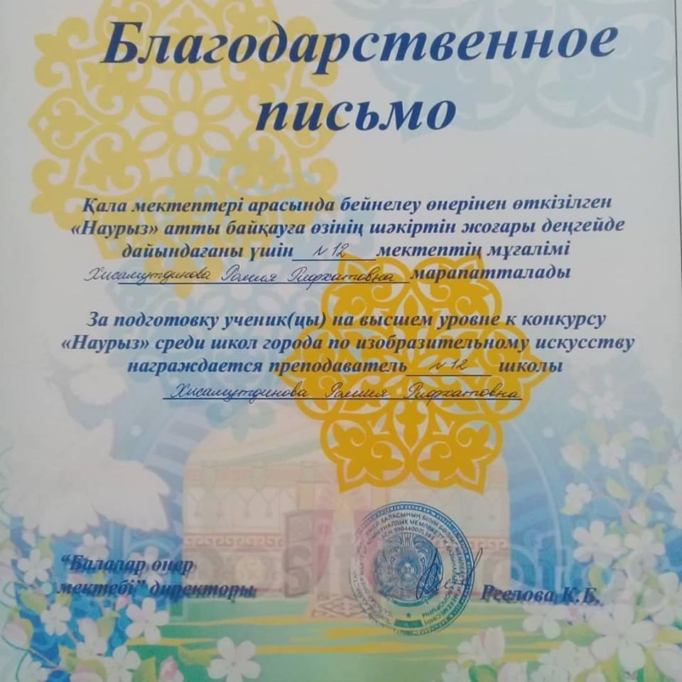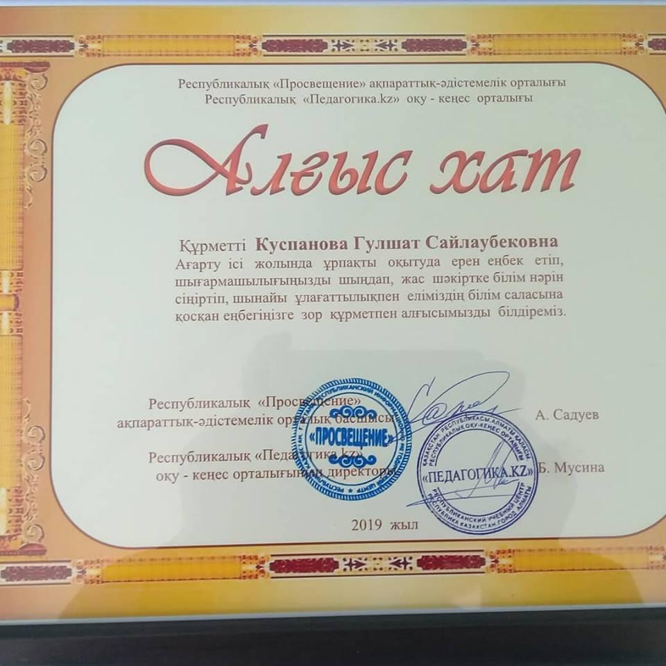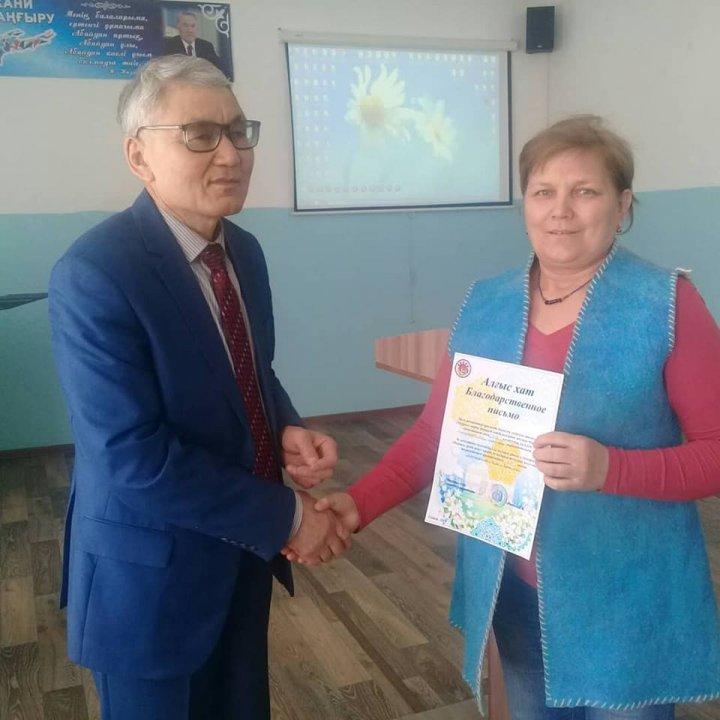13.04.2019 ж. педагогикалық жиналыста мектеп директоры Кусаинов Б.Ж. қызметкерлерімізді еңбектері үшін марапатталған Алғыс хаттарын табыстап, мектеп ұжымы атынан құттықтады.