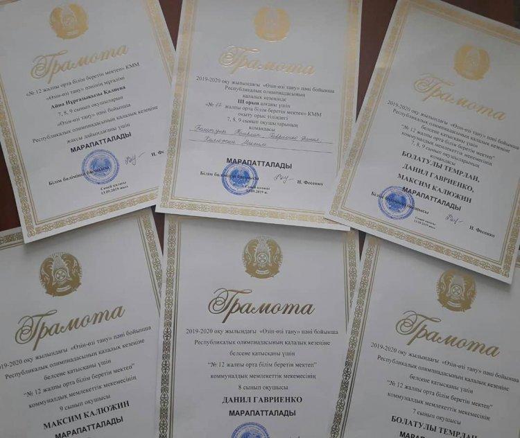 Республикалық олимпиаданың қалалық кезеңінде өзін-өзі тану бағыты бойынша мектебіміздің оқушылары жүлделі 3-орынға ие болды. Олар: Калюжин Максим 9а, Гавриенко Данил 8в, Болатулы Темрлан 7б. Ғылыми жетекшісі: Қалиева Айна Нұрғазықызы.