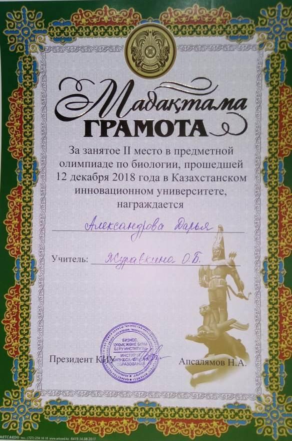 14 декабрь 2018 0 1 2 3 4 5 Олимпиада 12.12.18 жылы Қазақстан инновациялық Университетінде биология пəнінен өткен олимпиада бойынша оқушымыз Александрова Дарьяны 2 орын иеленуімен және жетекшісі Журавкина О.Б. ҚҰТТЫҚТАЙМЫЗ!!!
